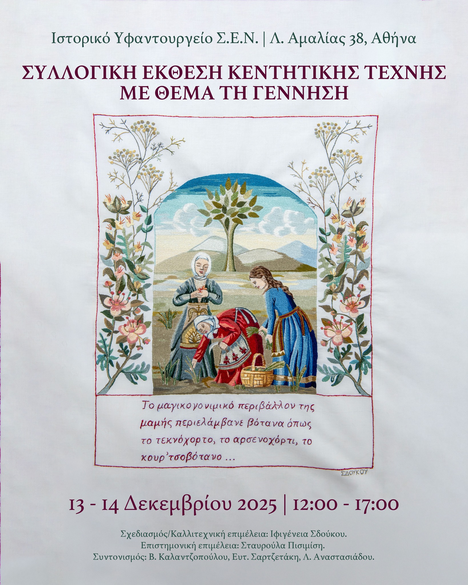 Στις 13 και 14 Δεκεμβρίου 2025, από τις 12:00 έως τις 17:00, το Ιστορικό Υφαντουργείο του ΣΕΝ - SEN Heritage Looms παρουσιάζει μια συλλογική έκθεση κεντητικής τέχνης αφιερωμένη στη γέννηση και στις λαϊκές παραδόσεις που τη συνοδεύουν.