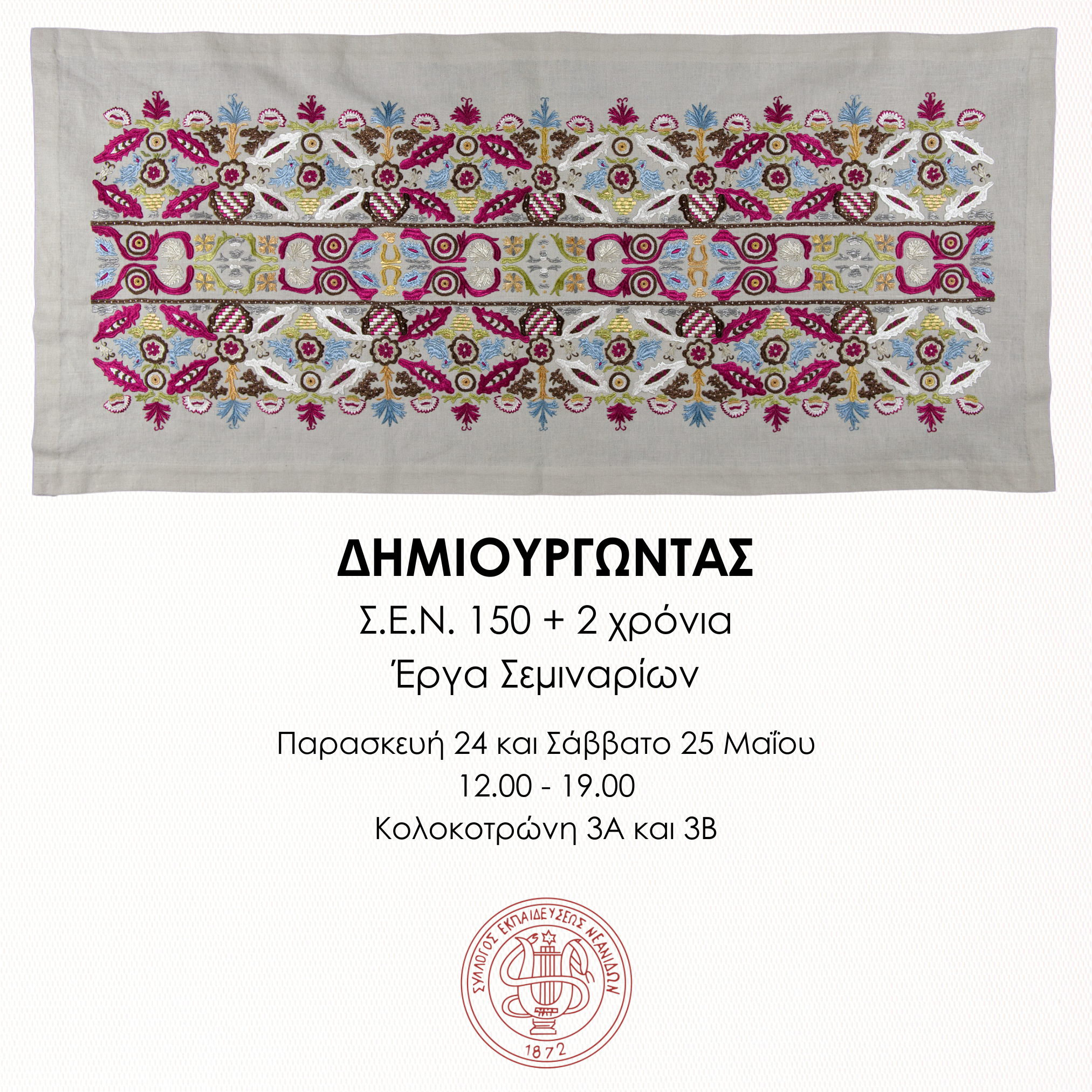 Στο πλαίσιο του εορτασμού των 150+2 χρόνων μας, σας προσκαλούμε στην έκθεση 'ΔΗΜΙΟΥΡΓΩΝΤΑΣ', με έργα από τα επιμορφωτικά σεμινάρια που πραγματοποιήθηκαν από τον Σύλλογο Εκπαιδεύσεως Νεανίδων κατά την περίοδο 2023-2024.
