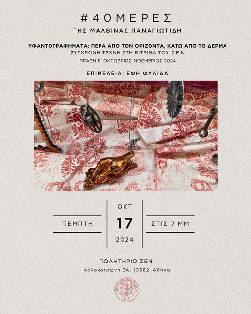 Σας προσκαλούμε να επισκεφθείτε τη νέα εγκατάσταση σύγχρονης τέχνης "40 Μέρες" της Μαλβίνας Παναγιωτίδη @malvinapanagiotidi, που παρουσιάζεται στη βιτρίνα του πωλητηρίου ΣΕΝ, στο πλαίσιο του project "Υφαντογραφήματα", υπό την επιμέλεια της Έφης Φαλίδα @falida.