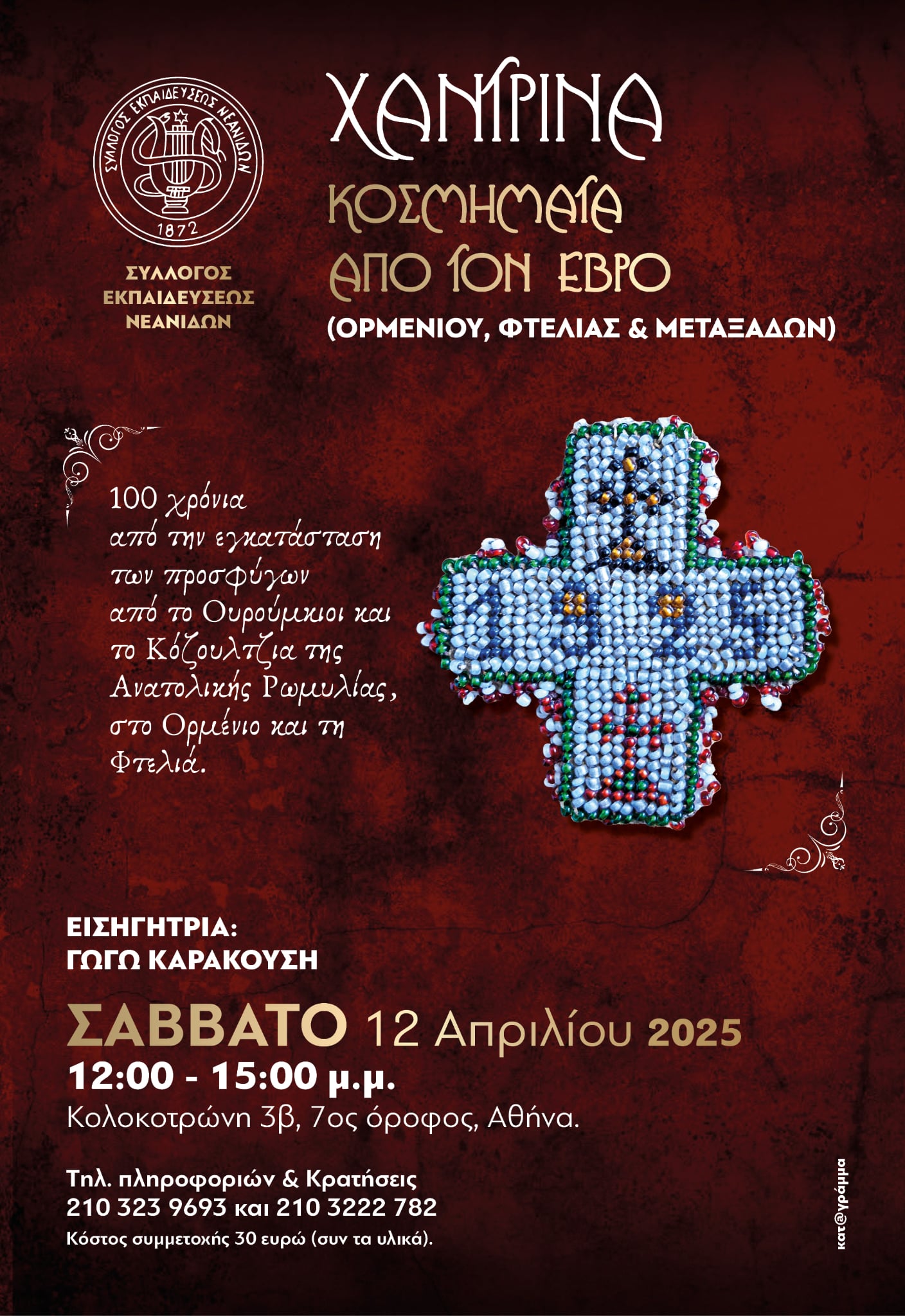 Τιμώντας τα 100 χρόνια από την εγκατάσταση των προσφύγων από το Ουρούμκιοι και το Κόζουλτζια της Ανατολικής Ρωμυλίας στο Ορμένιο και τη Φτελιά, το ΣΕΝ διοργανώνει ένα ειδικό workshop Χάντρινων Κοσμημάτων από τον Έβρο, με εισηγήτρια τη Γωγώ Καρακούση, το Σάββατο 12/4, 12:00 - 15:00, στο κεντρικό κτίριο του ΣΕΝ (Κολοκοτρώνη 3Β, 7ος όροφος).