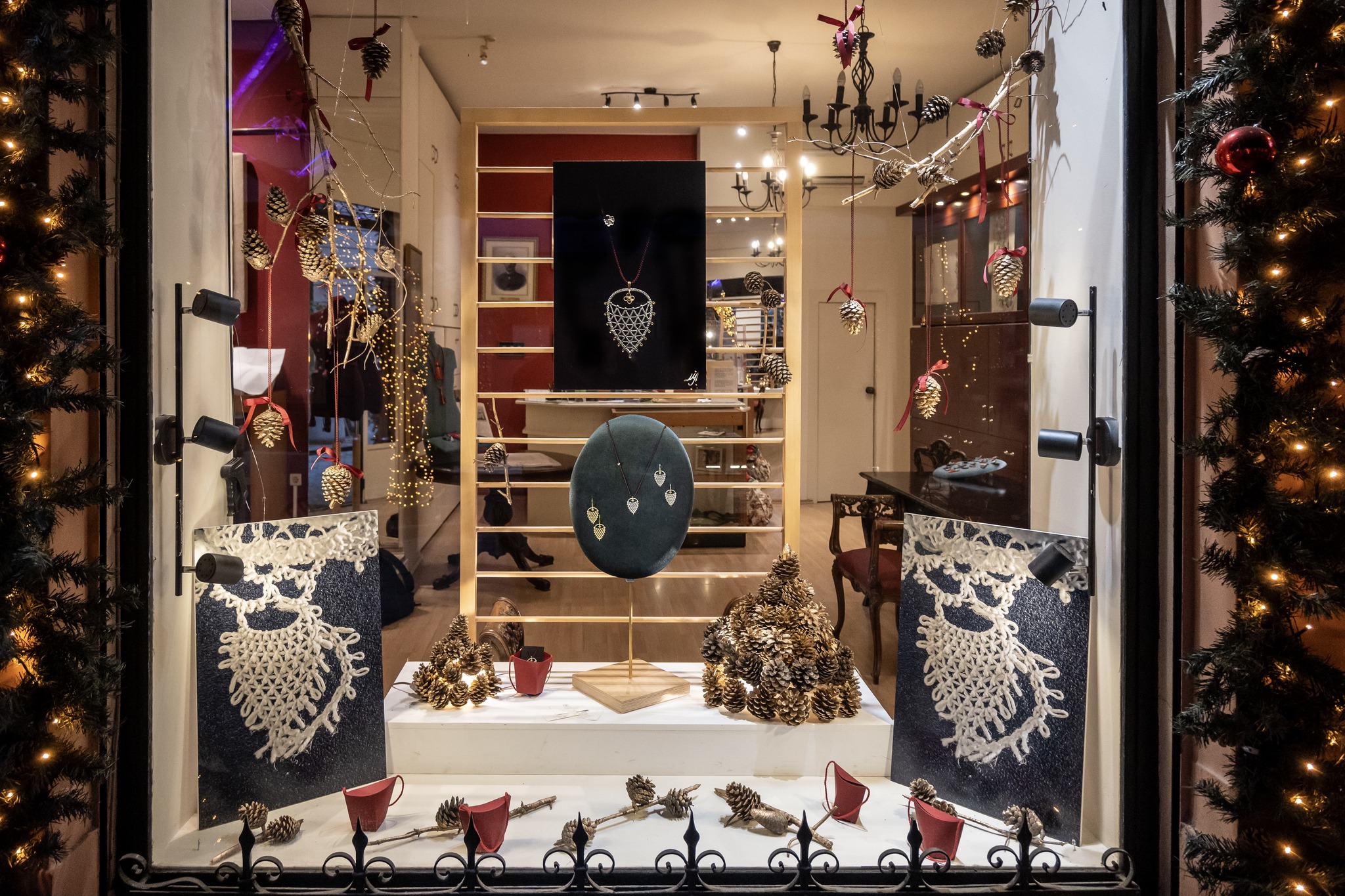 Μέσα από τον ανεκτίμητο θησαυρό χειροτεχνημάτων που φυλάσσονται στα αρχεία του Συλλόγου Εκπαιδεύσεως Νεανίδων (ΣΕΝ), ένα λεπτοδουλεμένο μοτίβο dentelle γίνεται η αφετηρία για τη νέα δημιουργία της Μαρίας Λιώνη. Με τη γνώριμη ακρίβεια και την καλλιτεχνική της ευαισθησία, η δημιουργός μεταμορφώνει την παράδοση σε ένα κόσμημα με καθαρή, σύγχρονη ταυτότητα.